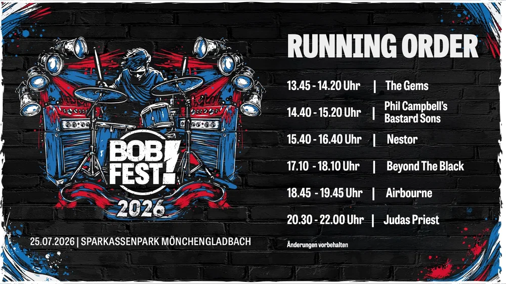 Das BOBfest 2026 schaltet einen Gang höher – und präsentiert ein Line-up, das die gesamte Bandbreite der Rock- und Metal-Welt in einem einzigen, intensiven Festivaltag vereint. Am 25. Juli 2026 wird der SparkassenPark Mönchengladbach zum Epizentrum für alle, die epische Klangwelten, legendären Rock’n’Roll und kompromisslose Gitarrenpower feiern wollen.